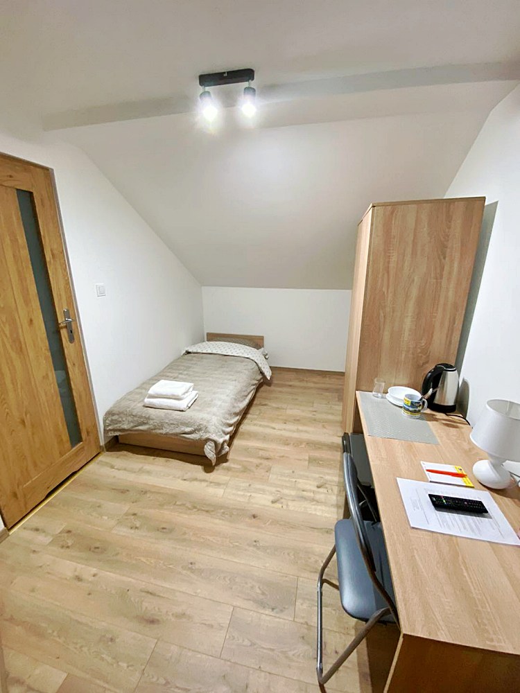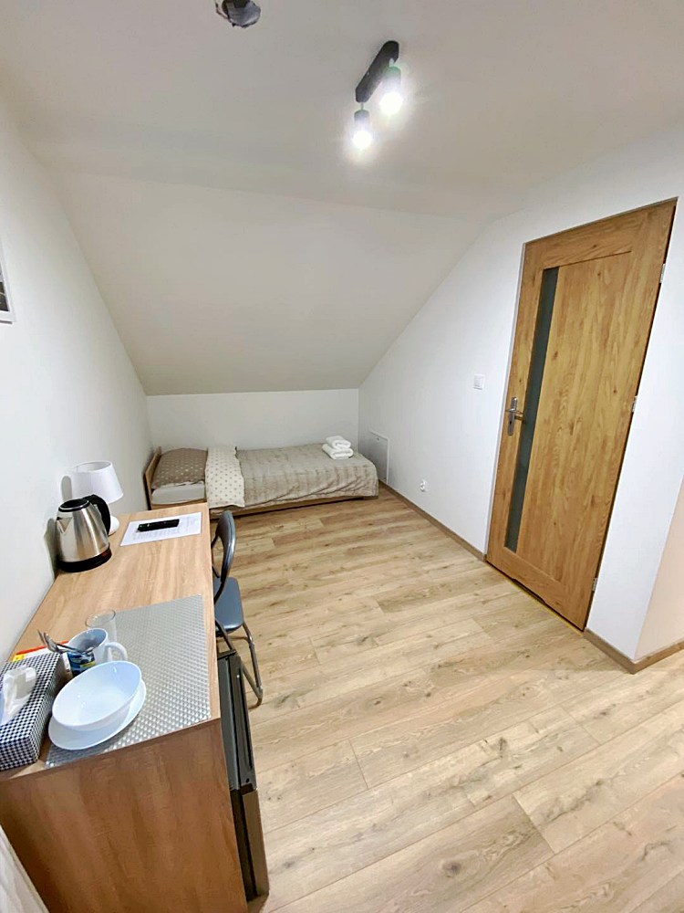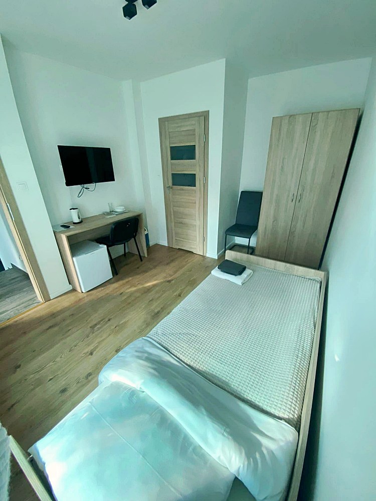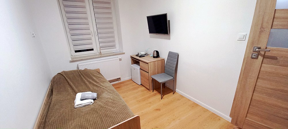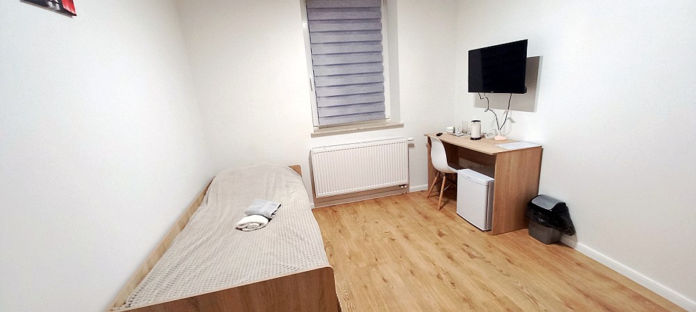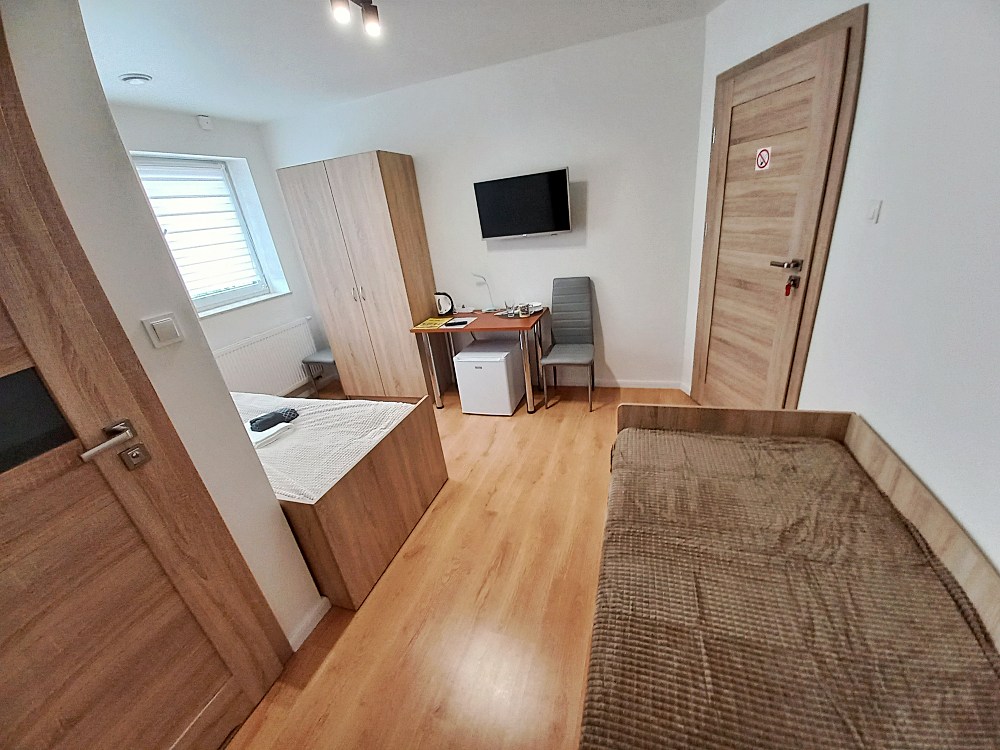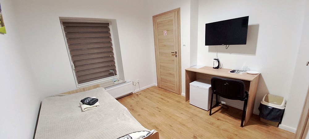 W każdym pokoju dla Twojej wygody znajduje się telewizor, lodówka, czajnik oraz niezbędne naczynia i sztućce