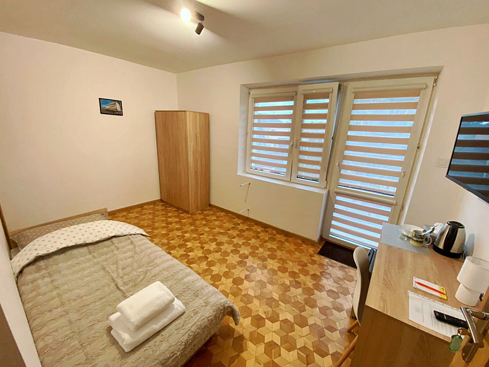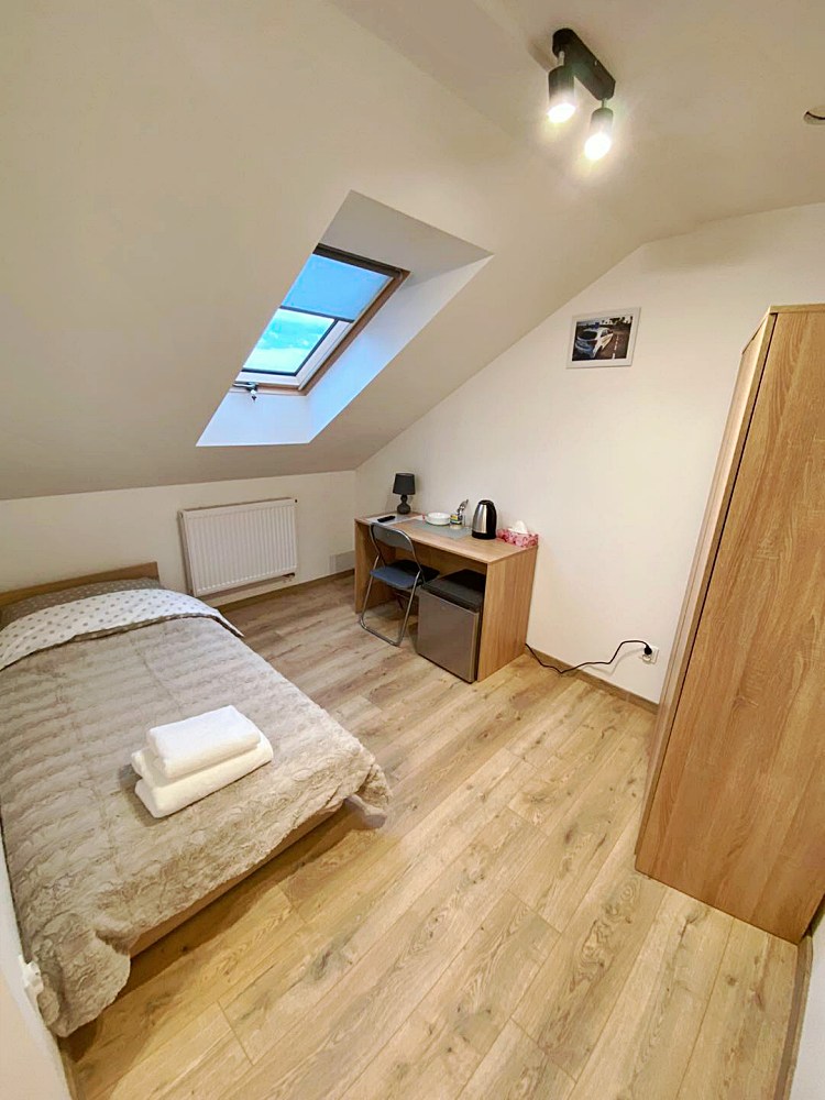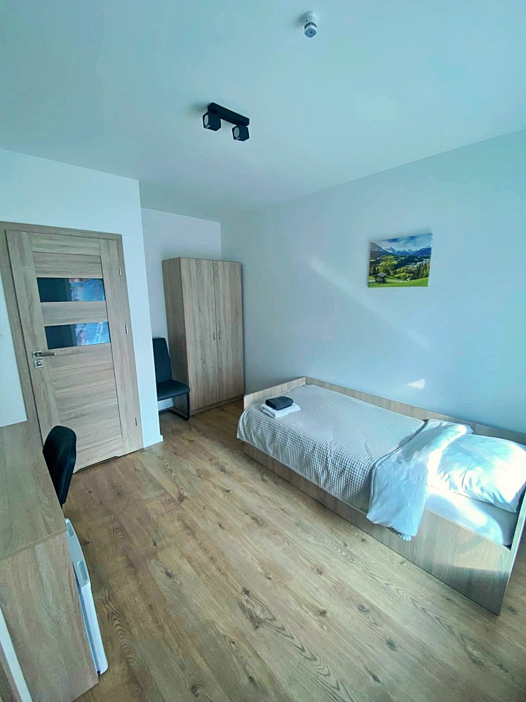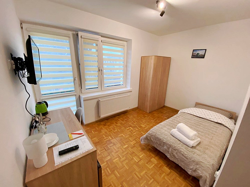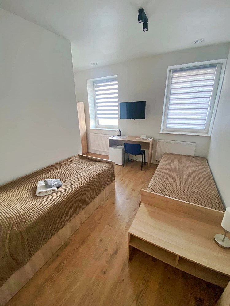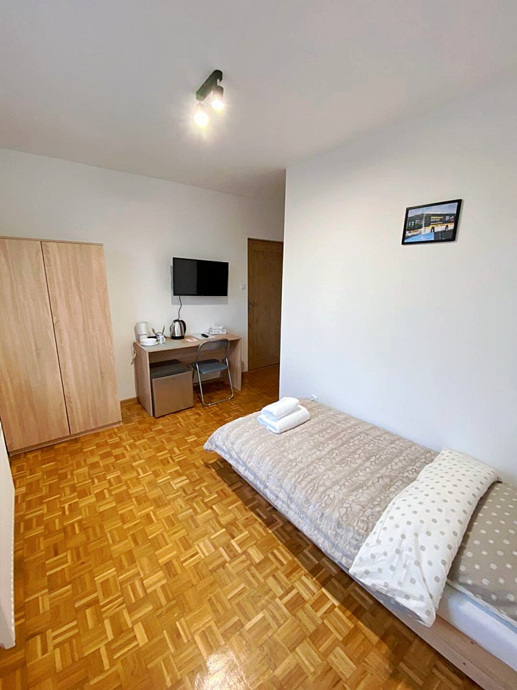 W każdym pokoju dla Twojej wygody znajduje się telewizor, lodówka, czajnik oraz niezbędne naczynia i sztućce